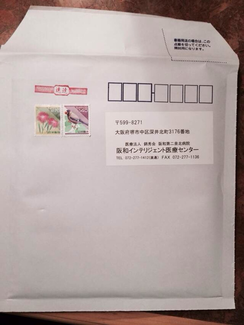 小护士知道我没排便,临走的时候给我了一个贴好邮票的信封,让我在日本期间如果排好了便,放进里面只要放进日本任何的一个邮箱里,就会快递到医院的。真是感叹日本医院服务的细致和周到,连这样的东西都细心地准备好了。最后还给每个客人一个小礼物表达对客人的感谢,全体翻译、护士和事物人员送到门口,鞠躬恭送我们离开。