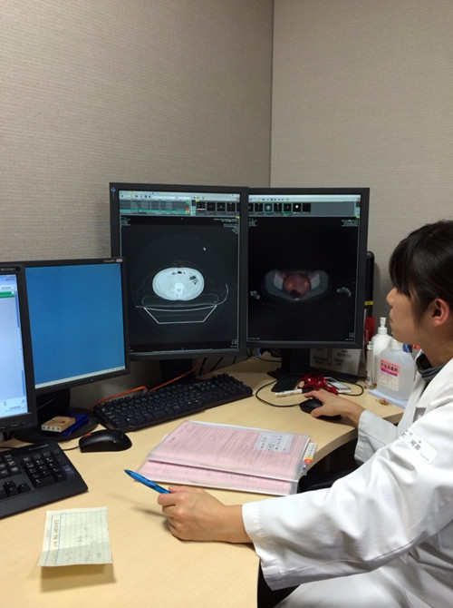 大夫是一边看电脑的影像一边说的,PET-CT的检查结果在电脑里可以看出3D的效果,是那种可以360度旋转的。看正面没什么问题,旋转到侧面的时候可以看到那个聚集点。当时我和老公都紧张了起来。