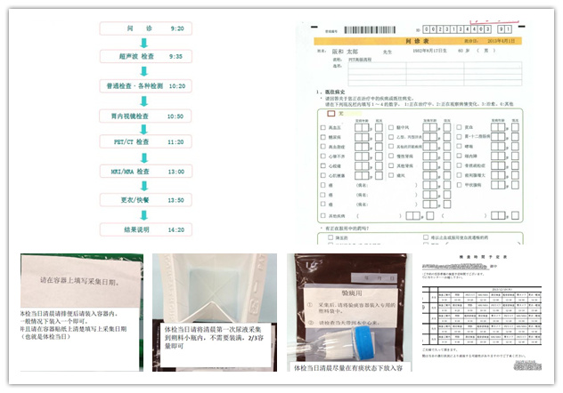 内容并不复杂,主要是看有没有既往病史,现在的自觉症状,家族病史,还有就是在胃镜和PET检查同意书上签字。我们夫妻两个人所有的材料都是日语的,其他的三个人的都是汉语的,很容易就可以填完。每个人一份的尿检,便检和痰检的小袋子,上面已经贴好了各自的名字。回房休息,第二天早上不吃不喝,接好尿便和痰就可以了。