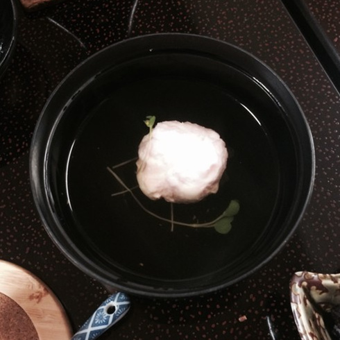 要说印象深刻的料理,就该说是最后上来的汤吧。本来以为是习惯了的酱汤,打开盖子,是淡淡的清水一样的汤,漂着点绿叶,里面还有个粉色的丸子,很是漂亮。早就听说日本汤的最高境界就是这样看似清水,实则异常鲜美的,赶紧喝上一口,清香、鲜美,回味绵长,真是极品。