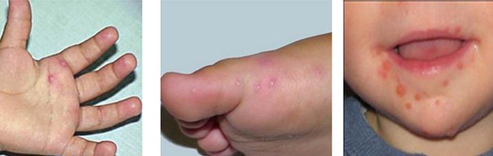 (1)急性起病,潜伏期3—5天,有低热、全身不适、腹痛等前驱症。口腔粘膜出现散在疼痛性粟粒至绿豆大小水疱,手、足出现斑丘疹、疱疹,初起为斑丘疹,后转变为疱疹,圆形或椭圆形,约3—7mm如米粒大小,较水痘皮疹为小,质地较硬,周围有红晕,疱内液体较少,在灰白色的膜下可以见到点状或片状的糜烂面。皮疹消退后不留瘢痕或色素沉着,如有继发感染常使皮肤损害加重。